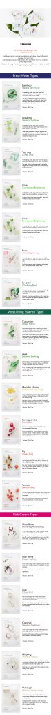 | Item Product | Acaiberry 10sheet, Aloe 10sheet, Bamboo 10sheet, Broccoli 10sheet, Coconut 10sheet, Cucumber 10sheet, Fig 10sheet, Ginseng 10sheet, Greentea 10sheet, Lime 10sheet, Manukahoney 10sheet, Oatmeal 10sheet, Pomegranate 10sheet, Rice, Rose 10sheet, Sheabutter 10sheet, Tea tree 10sheet, Tomato 10sheet |